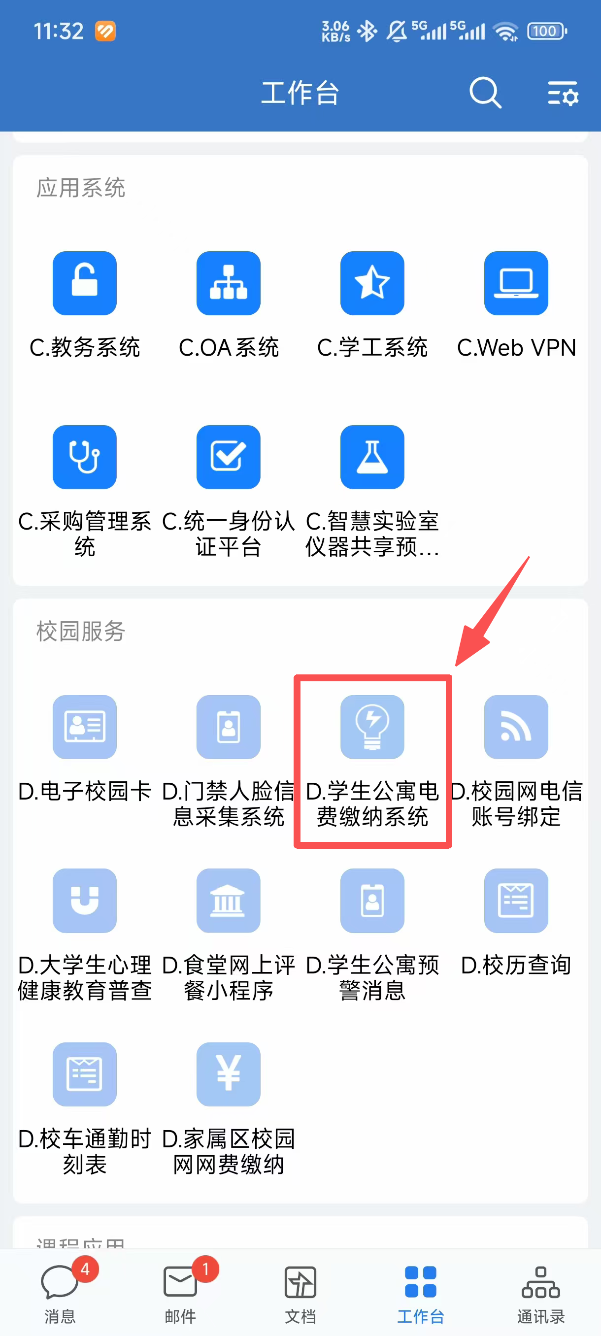 (3)在企业微信【工作台】,找到【D.学生公寓电费缴纳系统】,即可进行住宿信息绑定。